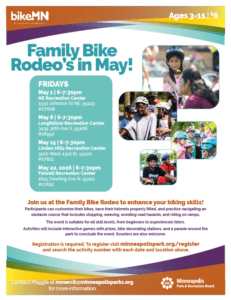 Family Bike Rodeo at Northeast Park Recreation Center on May 1, from 6 pm to 7:30 pm