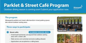 Parklets turn curbside parking spots into small seasonal public spaces with seating, plantings, and more. They help make our city more walkable and welcoming. Street cafés Continue Reading