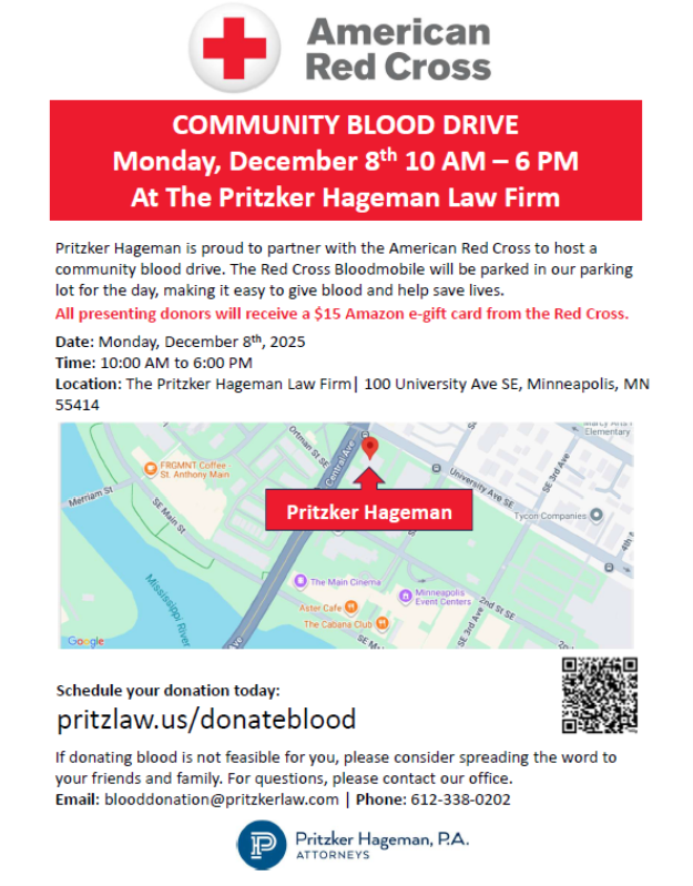 Our friends at Pritzker Hageman Law Firm are partnering with the American Red Cross to host a Community Blood Drive on Monday, December 8, 2025, from 10 AM to 6 PM at their office (100 University Ave SE, Minneapolis).