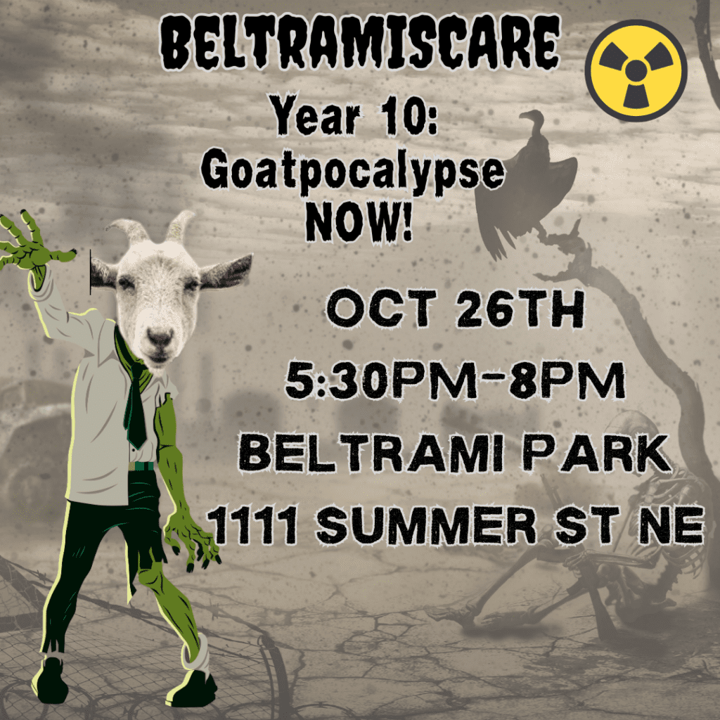LNENA is hosting the 10th annual BeltramiSCARE: Goatpocalypse NOW! (How I learned to stop FEARING and LOVE the goat). On October 26th from 5:30PM-8PM, there will be haunted tours every 15 minutes in Beltrami Park. The year is 2057 and NE Minneapolis is now a desolate Mad-Max-ish landscape, lone survivors come across what was once Maple Hill Cemetery for ghoulish discoveries of the past!