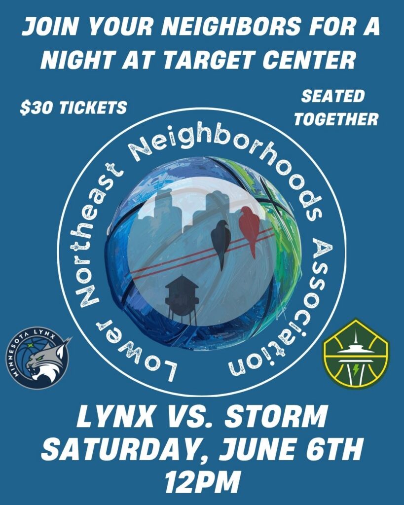 Calling all Lynx fans!! 🏀🚨 Cheer on the Minnesota Lynx with your neighbors! Use promo code LNENANIGHT26 to get discounted tickets at the June 6th game against the Seattle Storm. We’ll be sitting in a Lower Northeast Neighborhoods section and joining a special fan experience. Time to show your team & neighborhood pride! Purchase tickets here: https://tickets.lynxbasketball.com/offers/5261