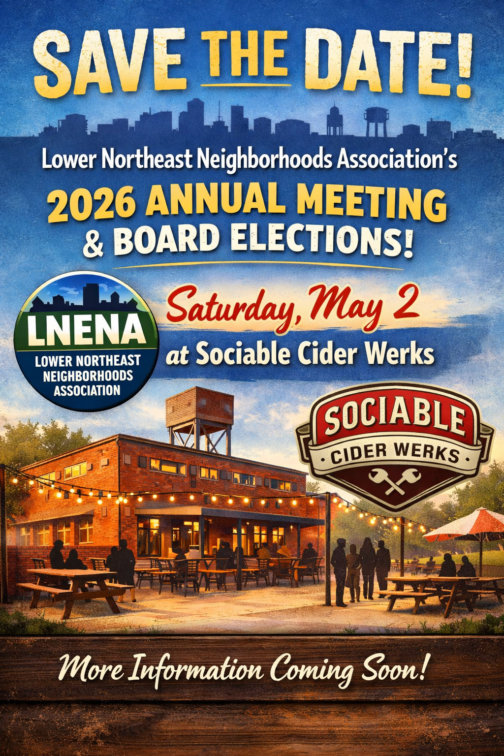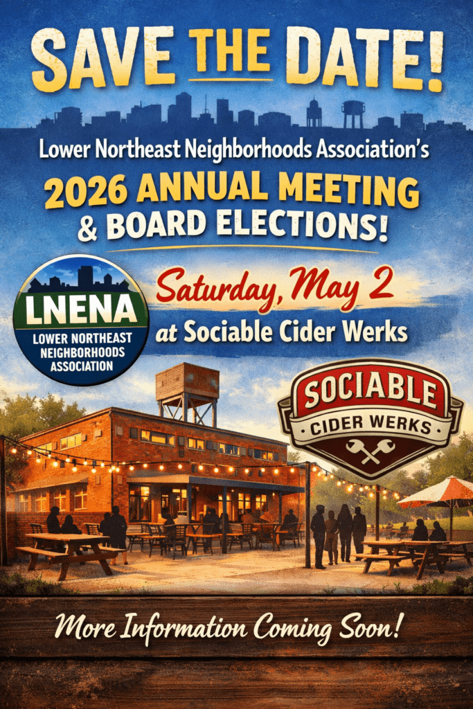 Mark your calendars and join us for the Lower Northeast Neighborhoods Association’s 2026 Annual Meeting on Saturday, May 2, at 3 p.m., Sociable Cider Werks, coinciding with the City of Minneapolis’ Neighborhood Day celebration! There will be free food available and Sociable Cider Werks will be providing one free beverage per person. There is no charge to attend this community event, but we are asking people to RSVP.