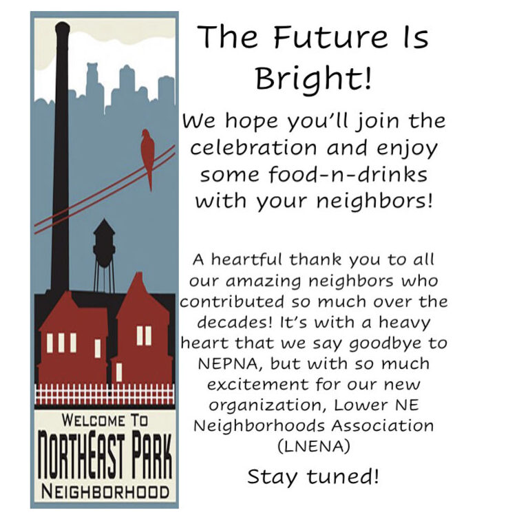 We hope to see a lot of neighborhood residents at this event, as this will be our last gathering as the Northeast Park Neighborhood Association. Starting in January, we will begin meeting as a merged neighborhood organization with the Beltrami neighborhood. The new neighborhood organization’s name is Lower Northeast Neighborhoods Association.