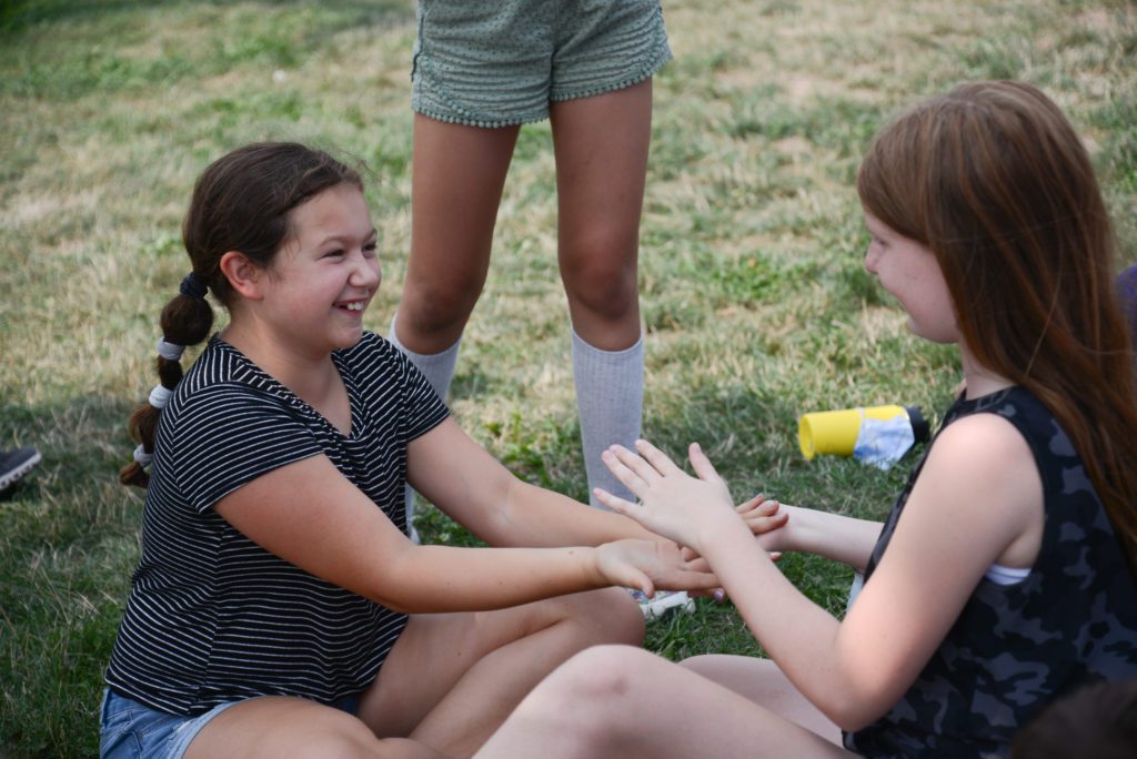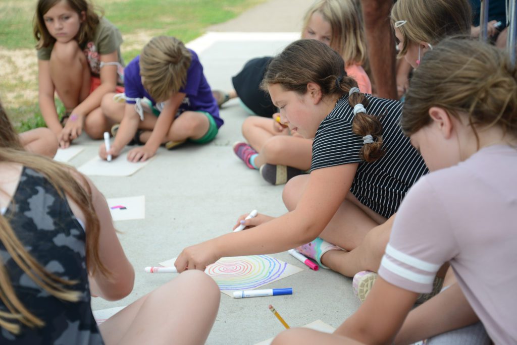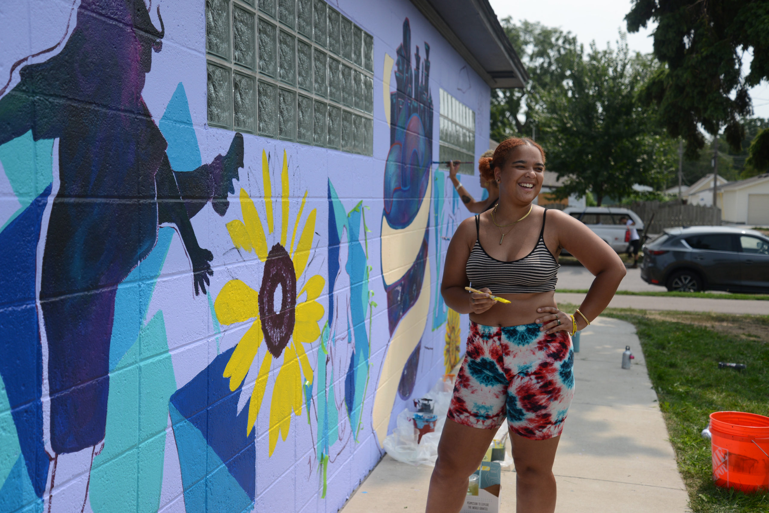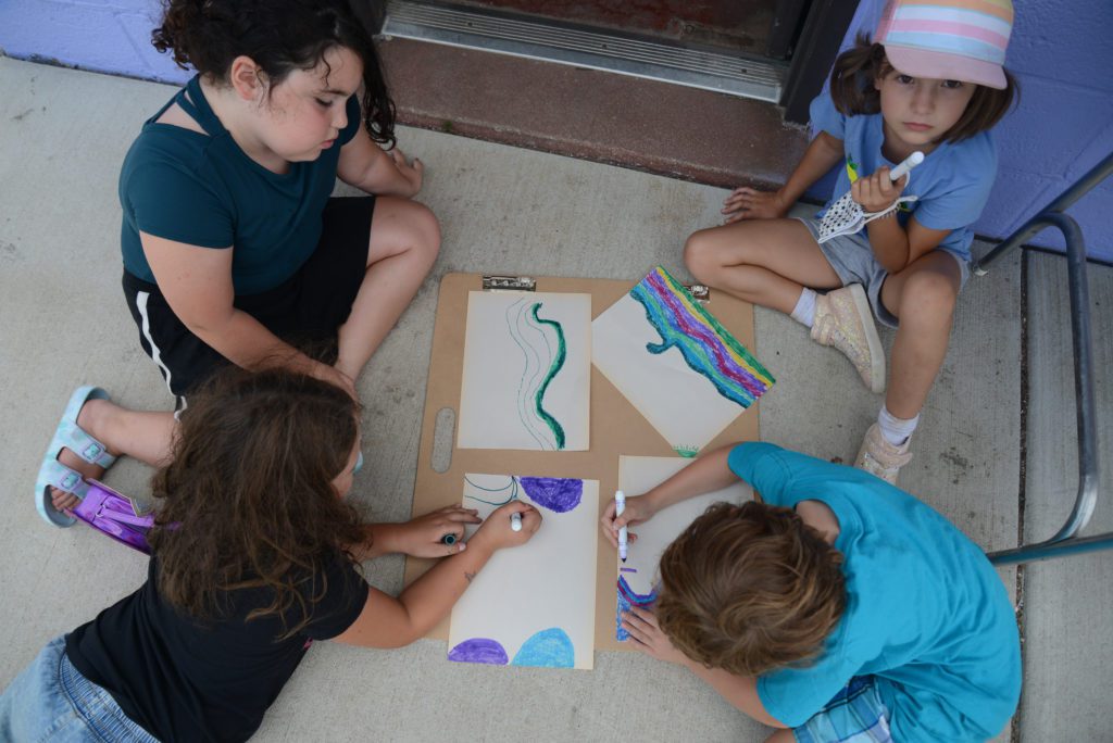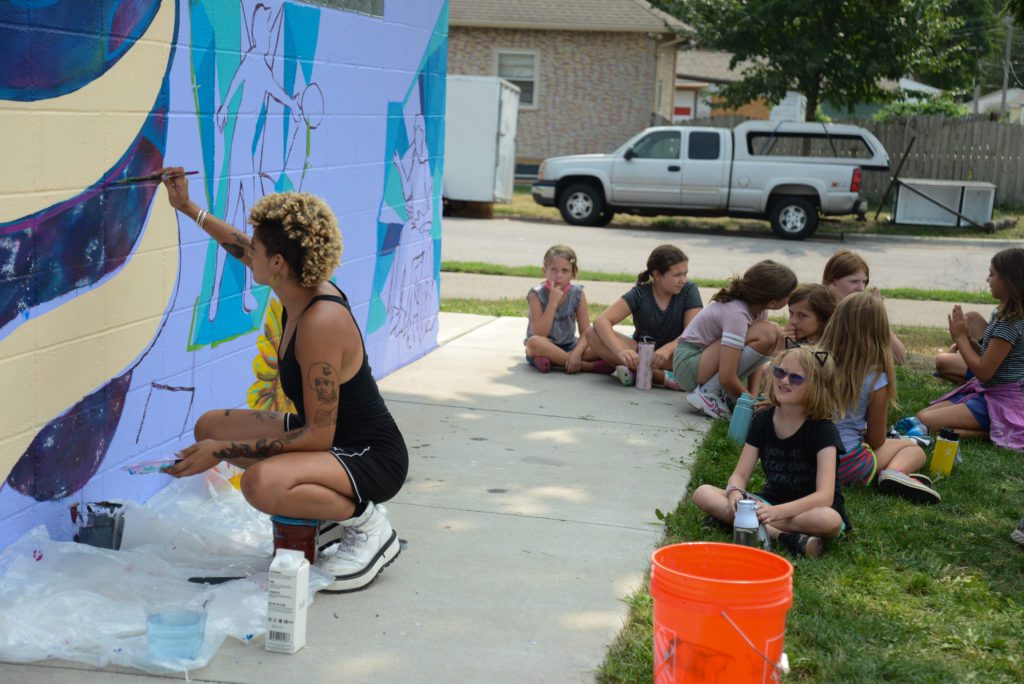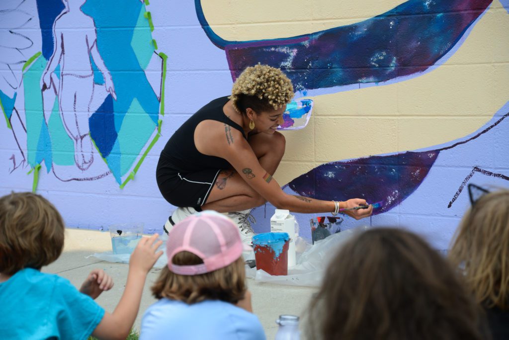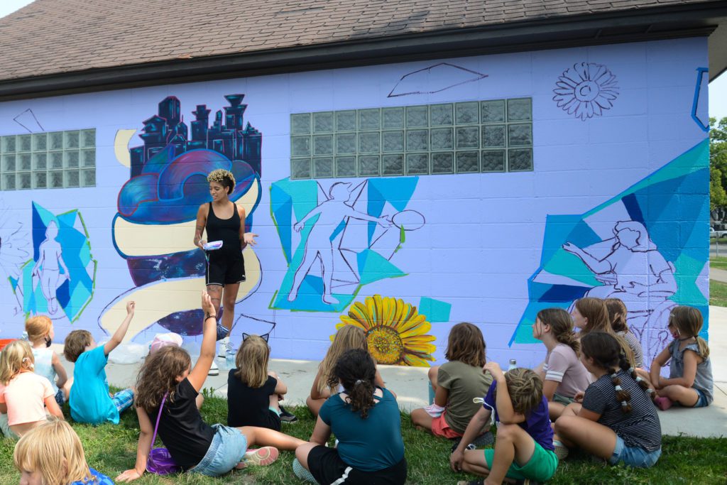 RecPlus youth ask mural artists questions and do their own art at the NE Athletic Field Park bathroom building.
