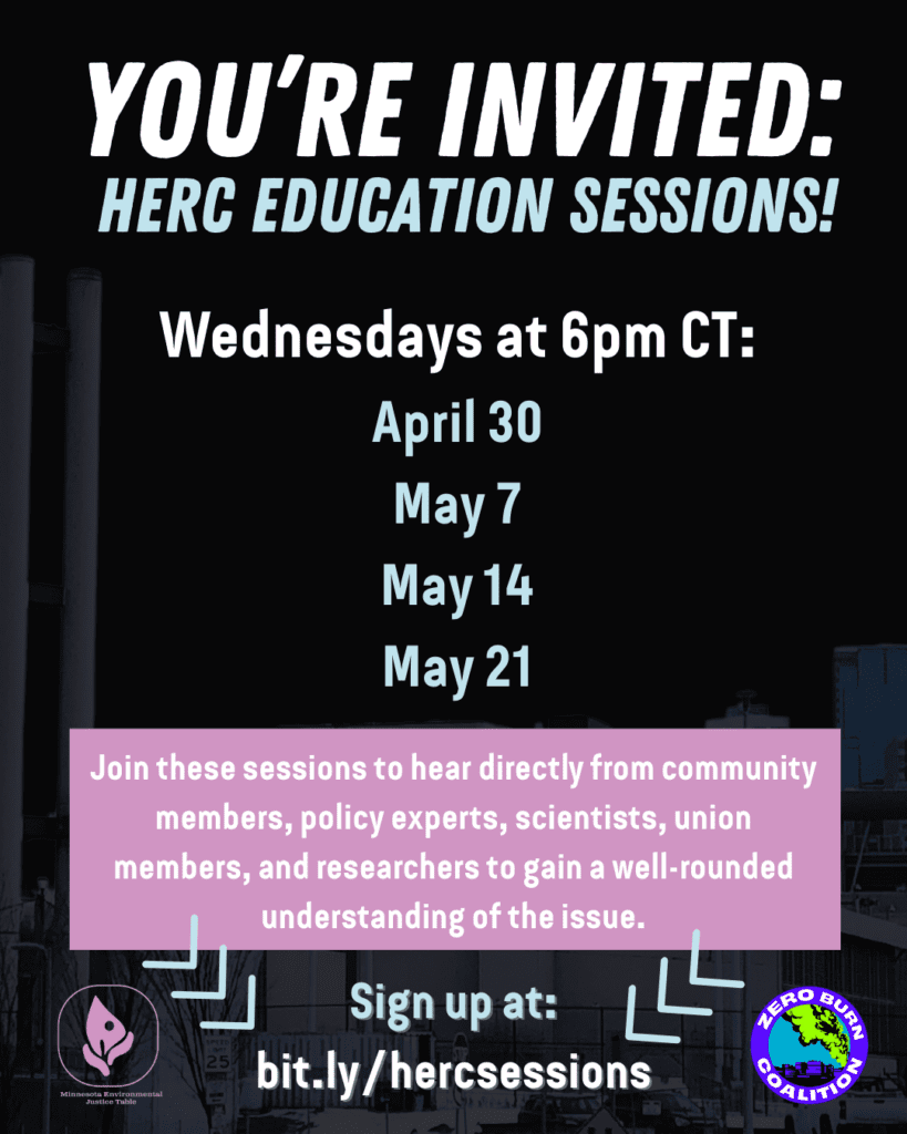 Join the education sessions to learn more about the Hennepin Energy Recovery Center (HERC)! These sessions will provide an opportunity to learn more about the facility’s operations, its environmental impact, and prepare you to directly engage with the public, legislators, and the county to advocate for HERC’s closure.